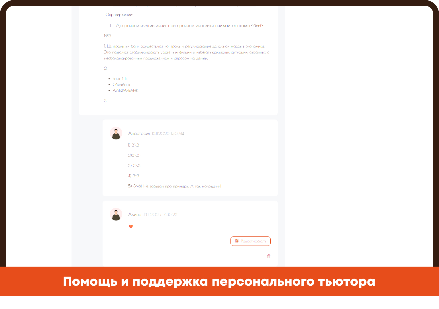 Задавайте вопросы напрямую преподавателю, мы всегда на связи! Она с радостью поможет вам разобраться в сложных темах и дадут необходимые разъяснения.